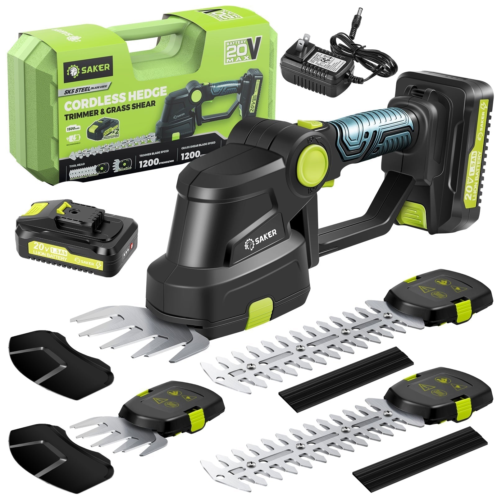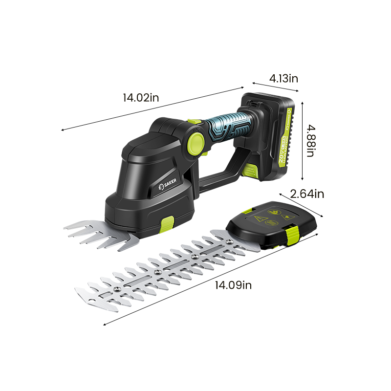 Specific 2-In-1 Tool: Saker electric hedge trimmer & grass shear is designed to switch from grass shear to hedger quickly and easily with blade release buttons. A short blade (Width of 4.13 Inches) is designed for cutting grass, and small sections of lawns, and a long blade (Length of 9.45 inches) is designed for thin shoots on hedges, bushes, trees, and ornamental shrubs. Saker battery-operated hedge trimmer with battery and charger can help you trim the lawn edge and cut shrubs efficiently.