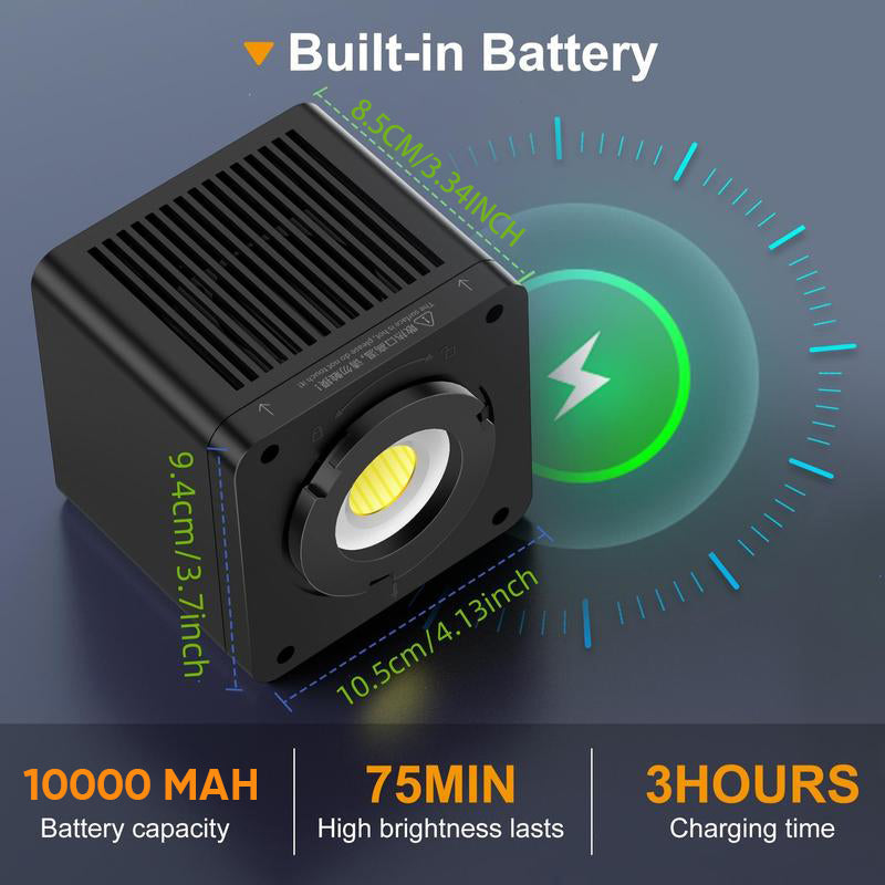 High-brightness illumination: This handheld light features a built-in 10,000mAh battery, providing up to 75 minutes of high-brightness illumination on a single charge. With a charging time of just 3 hours, it's ready to go when you are. Compact in size at 9.4cm (3.7 inches) wide and 10.5cm (4.13 inches) tall, it’s perfect for on-the-go creators who need reliable lighting in any environment. Whether you're shooting indoors or outside, this portable light ensures professional results with ease.