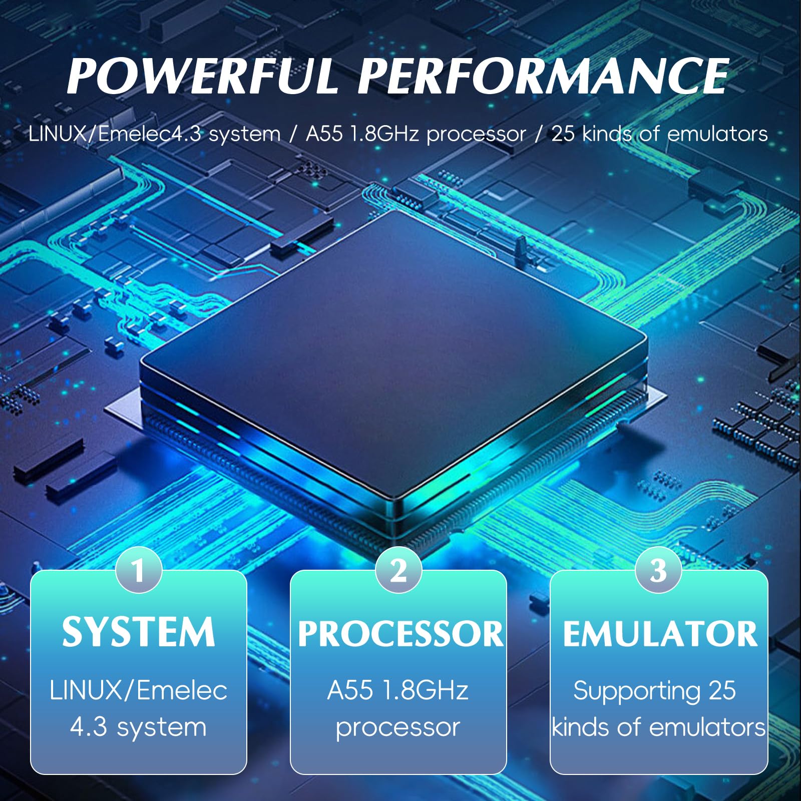 Powerful performance: Equipped with a robust LINUX/Emelec4.3 system, a potent A55 1.8GHz processor, and supporting 25 kinds of emulators, the M25 Retro Game Player assures smooth gameplay even for the most demanding retro games.