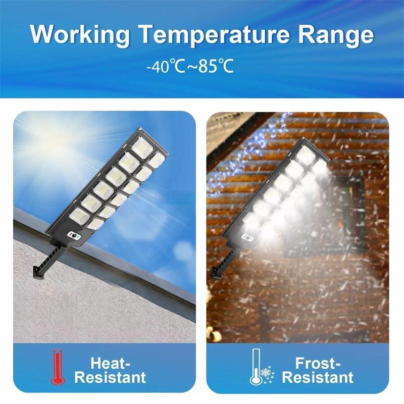 Solar street light: Illuminate large outdoor areas with the powerful 100,000 lumens of this solar street light. Featuring solar charging, it operates without electricity costs while being eco-friendly. Built to withstand the elements, it's fully waterproof and designed for long-term outdoor use. Equipped with a smart motion sensor and remote control, it offers hands-free convenience and intelligent lighting, adjusting brightness automatically based on movement.